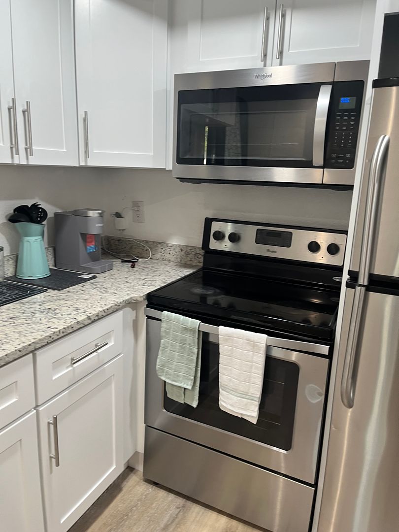 The kitchen comes equipped with a fridge, sink, oven, stovetop, as well as basic cookware, making it the perfect spot to whip up a meal or two.